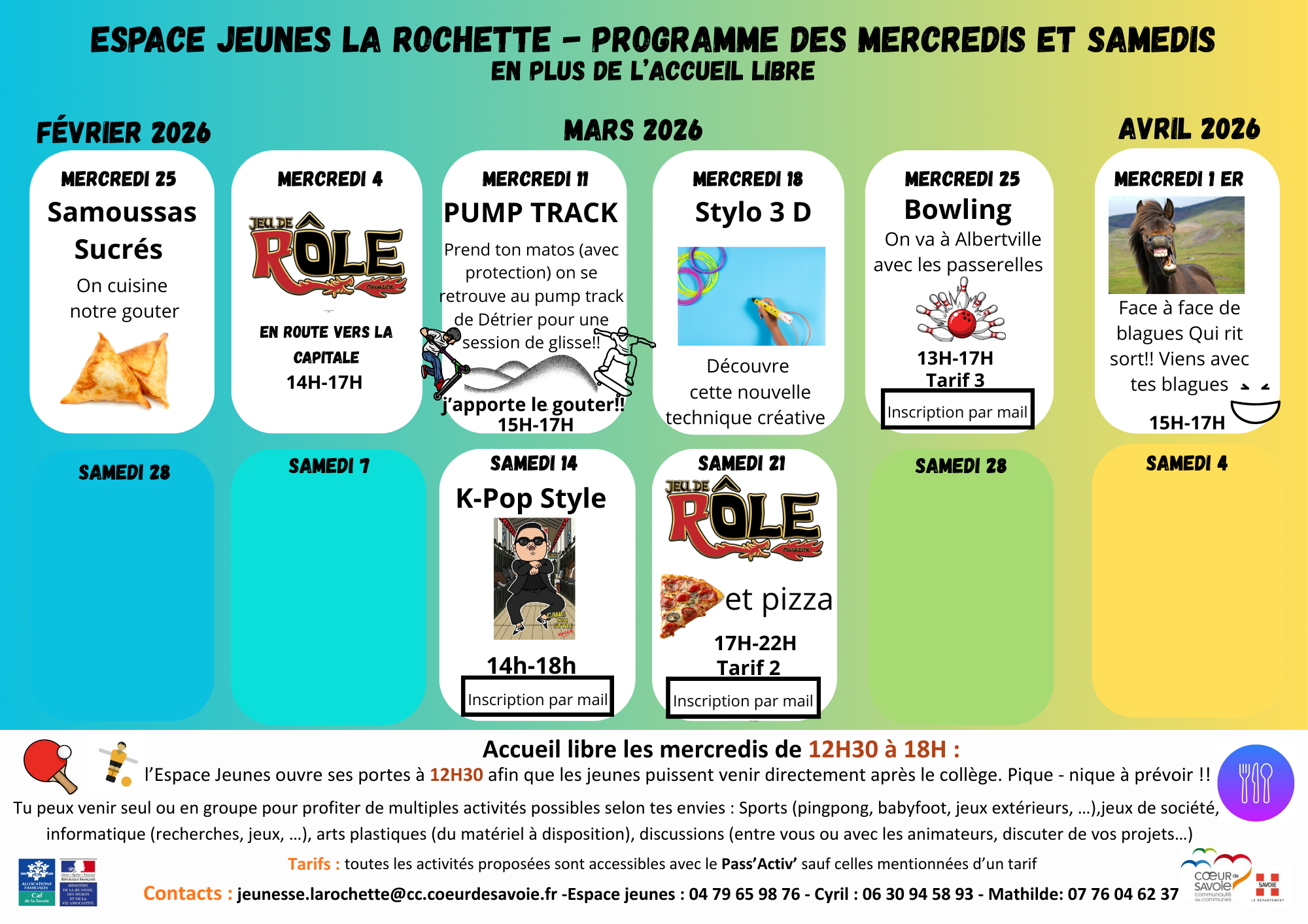 - à l’Espace jeunes les mercredis de 12H30 à 18H (les jeunes peuvent venir avec leur repas) et les samedis selon le programme