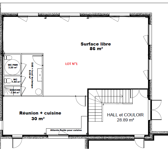 - LOT 1 : 130 m²- 86 m² à cloisonner+ 30 m² de salle de réunion/kitchenette avec accès terrasse + bloc sanitaire