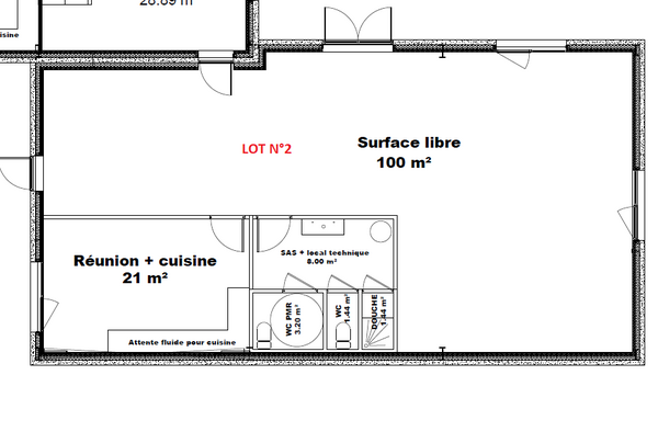 - LOT 2 : 135 m² - 100 m² à cloisonner+ 21 m² de salle de réunion/kitchenette avec accès terrasse + bloc sanitaire